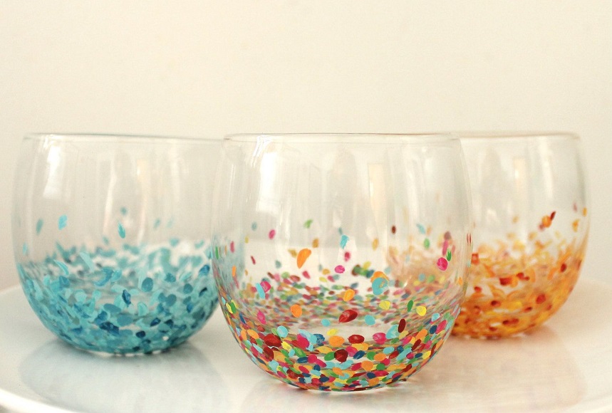 Now that the confetti is cut in various sizes and it is ready, peel off the backing and stick them on the outside of your cocktail glasses. These glasses will surely impress your party guests.